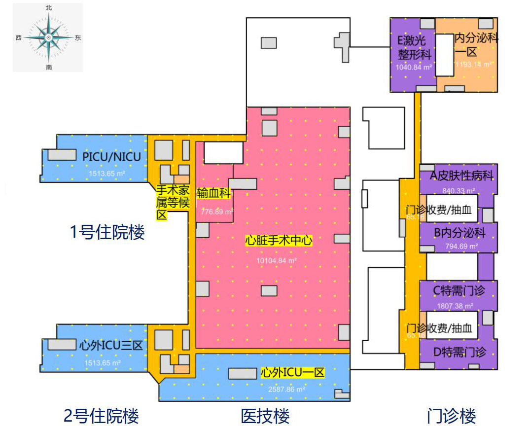 2F:门诊挂号室 住院处 中草药房 住院服务中心 门诊部 门诊接待室急诊导医台 急诊诊区 急诊注射、抽血室 急诊输液室 急诊药房